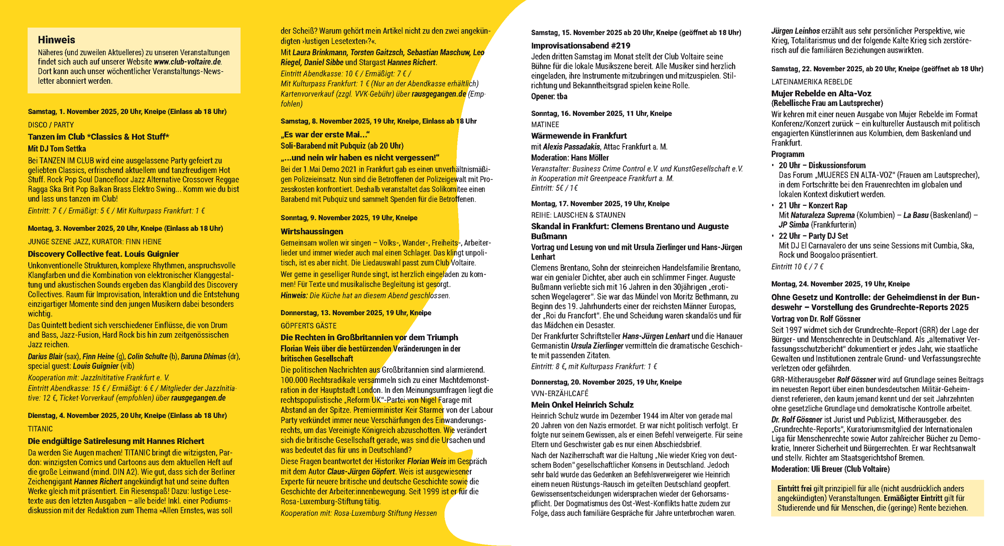 Redesign des Monatsprogammflyers: ein erster Schritt mit komplett neuer Gestaltung der Titelseite mit Logo, Claim und QR-Code für gute Sichtbarkeit und Übersetzung des Voltaire-Profils in aktualisierter Form.