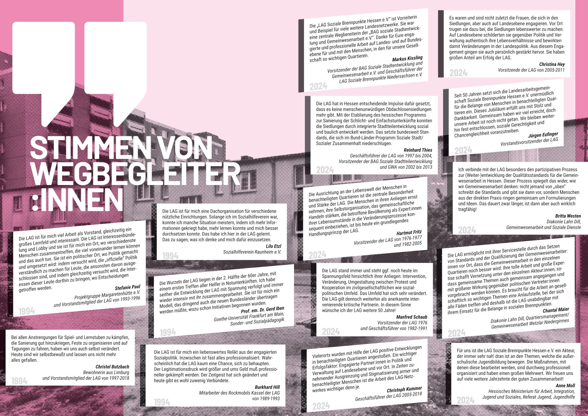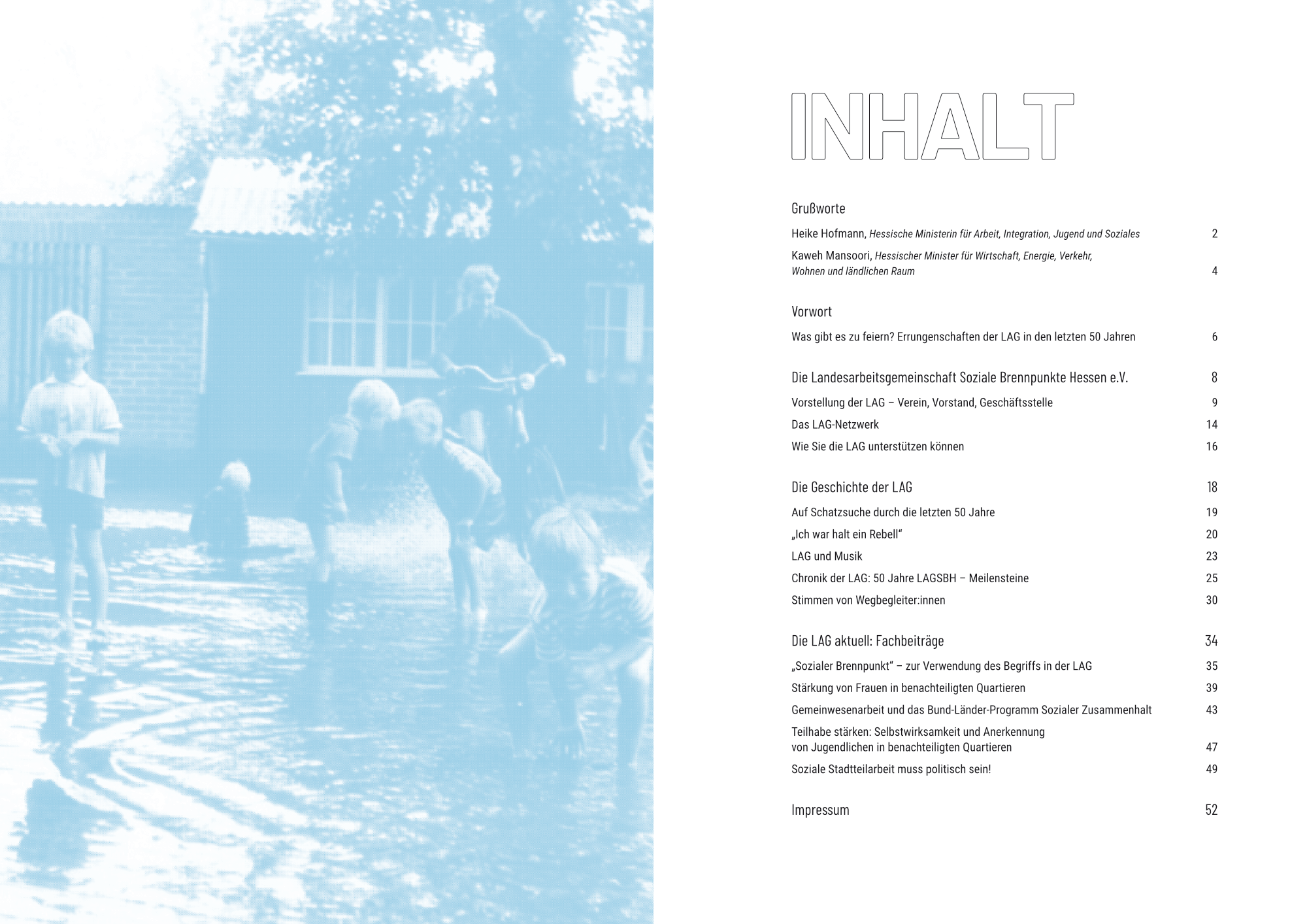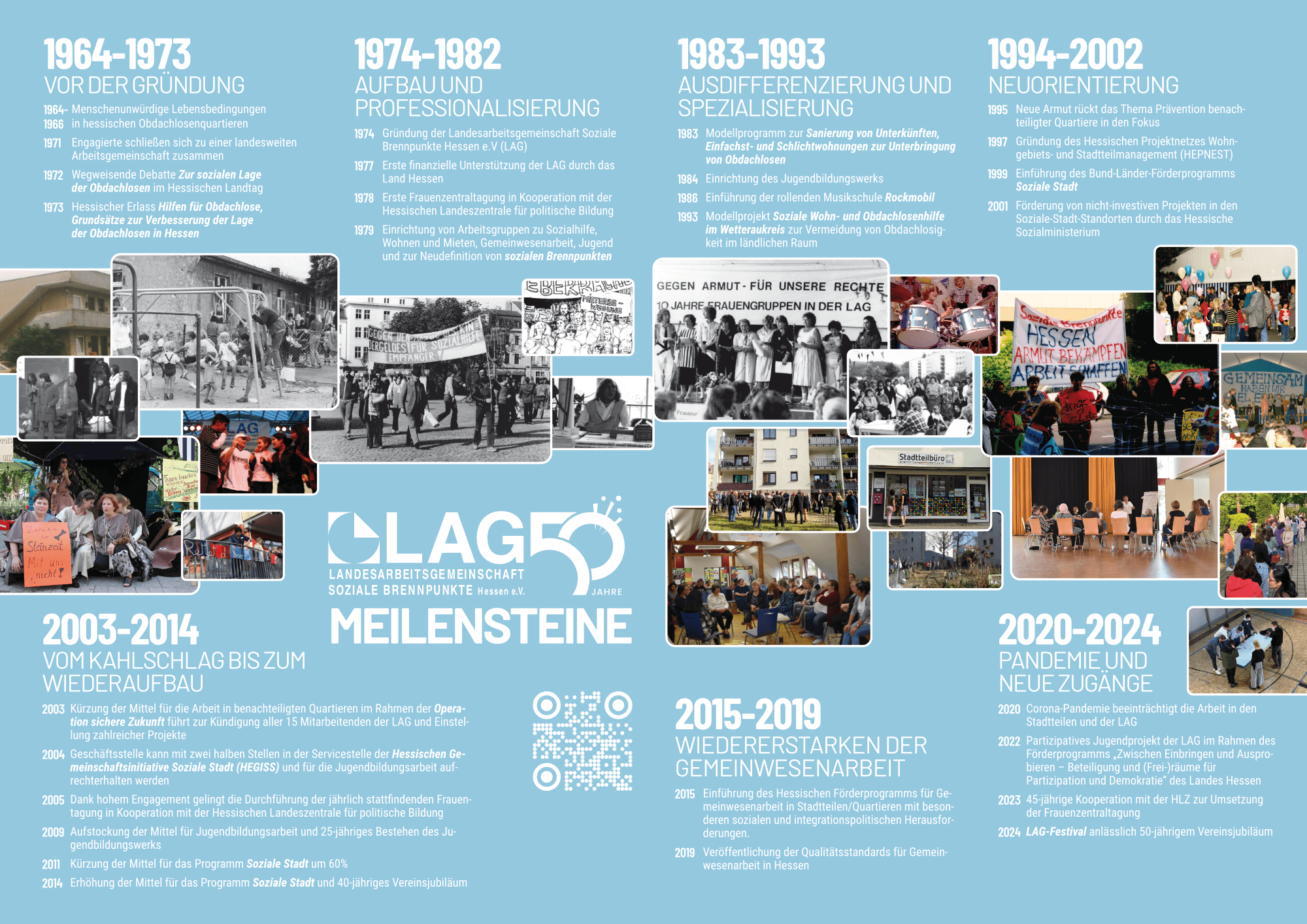 2024 feiert die LAGSBH ihr 50-jähriges Bestehen und gibt eine Festschrift heraus, mit der sie Einblick in ihre lange Geschichte sowie in aktuelle fachliche Diskurse im Feld der sozialen Stadtentwicklung in benachteiligten Quartieren gibt.