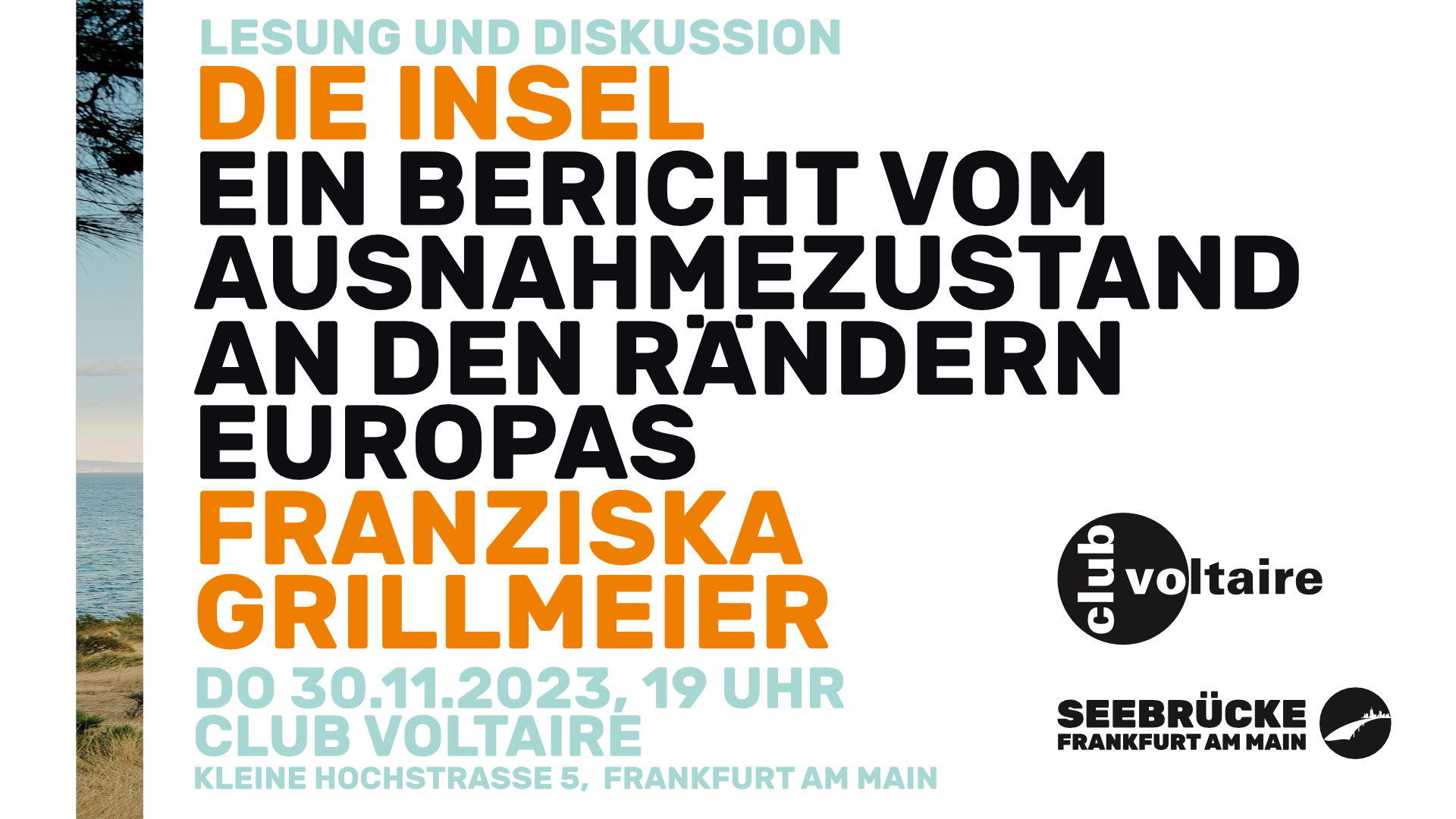 Lesung im Club Voltaire: Die Insel wird bei Franziska Grillmeier zu mehr als Lesbos oder ähnliche Places of Isolation. Sie ist die Festung Europa, ein ebenso unmenschliches wie tödliches Abschottungsregime. Plakat, Flyer, Sharepics